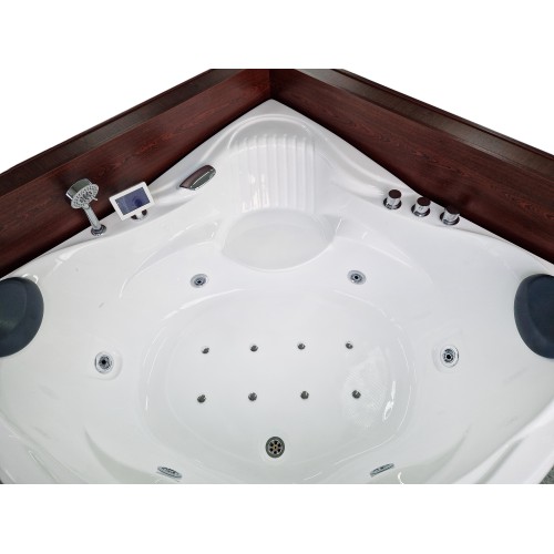 Masažinė kampinė dvivietė vonia su vandens ir oro masažu, ir vandens šildytuvu.